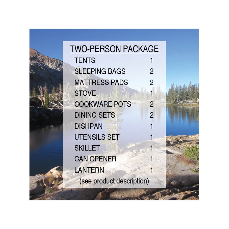 This car-camping rental package has most of the pieces needed for a comfortable camping experience for two people - a roomy, weatherproof tent; warm sleeping bags; comfortable, insulated mattress pads; and a suitable selection of cooking gear and other accessories.