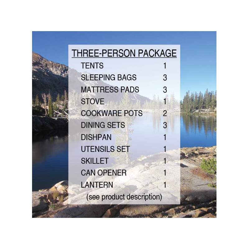 This car-camping rental package has most of the pieces needed for a comfortable camping experience for 3 people - a roomy, weatherproof tent; warm sleeping bags; comfortable, insulated mattress pads; and a suitable selection of cooking gear and other accessories.