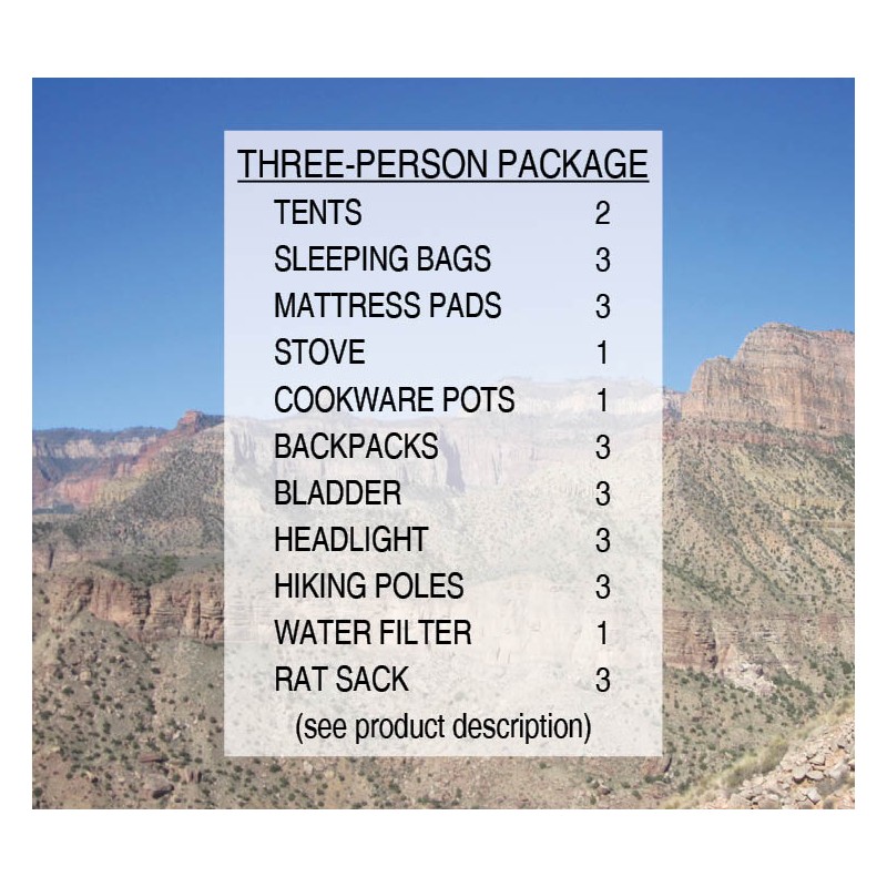 This is a ready-to-go gear rental package for three backpackers headed out to the Grand Canyon here in Arizona. If you have access to some gear already and don't need everything listed below, then you should consider renting gear from our site a la carte - you can browse all of our gear by rental category from the menu options at the top of this web page. A preset package like this does only represent what a "lot of people" could use, but maybe not you - in that case, order a la carte. It may be easier to work with a package approach, however, as all you have to do is do a little shopping for food, some incidentals and you're ready to head out for a great backpacking trip. But like tonight's special at your favorite restaurant, "no substitutions please" (except for sleeping bags; see below).