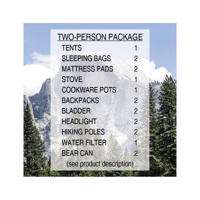 This is a ready-to-go gear rental package for two backpackers headed out to Yosemite or Yellowstone National Park. Suitable of course for any other area known for bear activity or where bear canisters are mandated. If you have access to some gear already and don't need everything listed below, then you should consider renting gear from our site a la carte - you can browse all of our gear by rental category from the menu options at the top of this web page. A preset package like this does only represent what a "lot of people" could use, but maybe not you - in that case, order a la carte. It may be easier to work with a package approach, however, as all you have to do is do a little shopping for food, some incidentals and you're ready to head out for a great backpacking trip. But like tonight's special at your favorite restaurant, "no substitutions please" (except for sleeping bags or packs; see below).