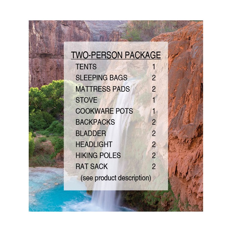 This is a ready-to-go camping rental package for 2 backpackers headed out to Havasupai Falls on the typical 3-night permitted trip, with a day's travel time before and after. Additional days are available via dropdown above if needed. If you have access to some gear already and don't need everything below, then you may want to rent the needed items from our site a la carte - browse all of our gear by rental category from the menu options at the top of this web page.