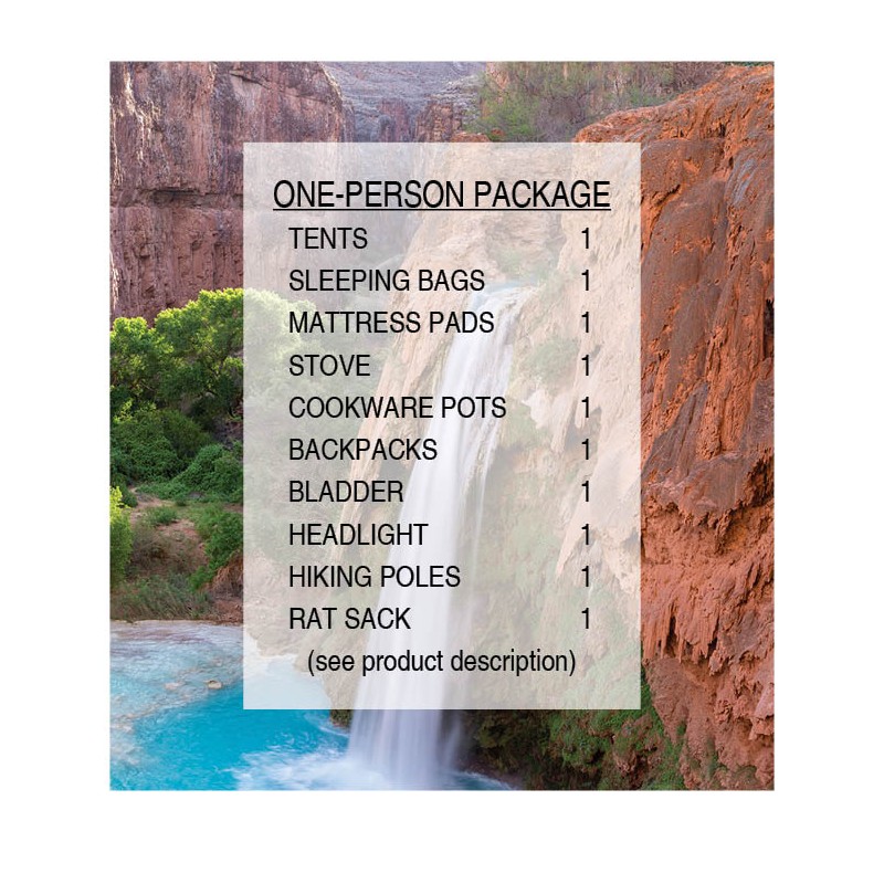 This is a ready-to-go camping rental package for 1 backpacker headed out to Havasupai Falls on the typical 3-night permitted trip, plus a day's travel time before and after. Additional days are available via dropdown above if needed. If you have access to some gear already and don't need everything below, then you may want to rent the needed items from our site a la carte - browse all of our gear by rental category from the menu options at the top of this web page. While this package has been curated for Havasupai, for sure it would be useful elsewhere as well. But we also offer more universal backpacking packages, with longer rental term options, that might be a better fit for your needs.